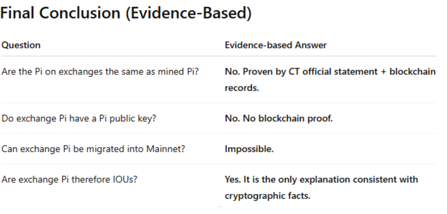 这证实了交易所中的“Pi”不在 Pi 区块链→上,因此不存在欠条。