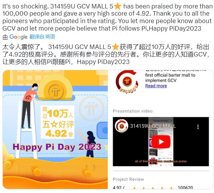 太令人震惊了。 314159U GCV MALL 5⭐获得了超过10万人的好评,给出了4.92的极高评分。感谢所有参与评分的先行者。你让更多的人知道GCV,让更多的人相信Pi跟随Pi,Happy PiDay2023