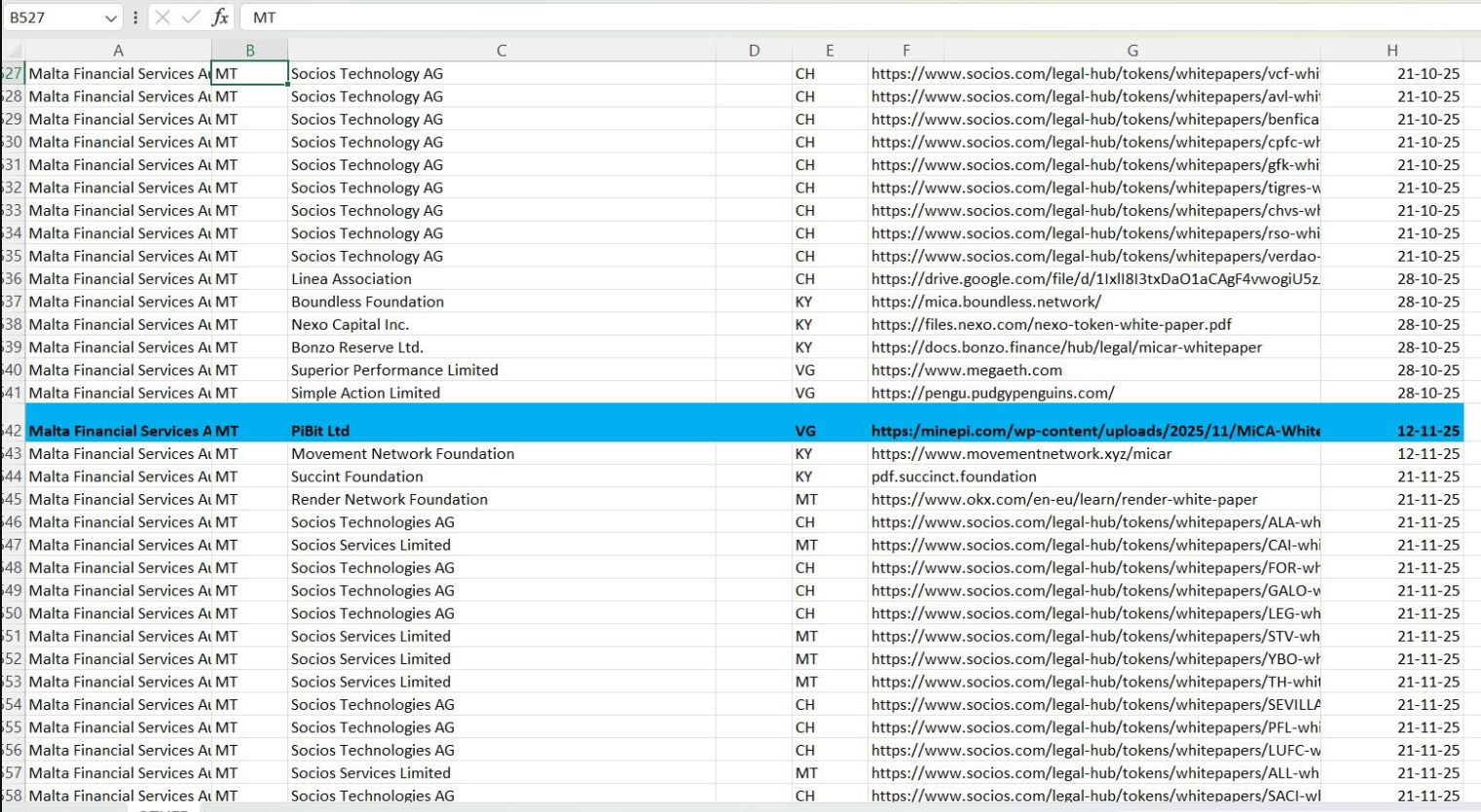 经查,Pi Network 的欧洲法律实体http://Pibit.LTD已出现在除 ART 和 EMT 之外的加密资产白皮书列表中。