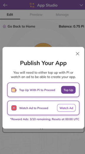 现在,先锋用户可以通过观看广告在 Pi App Studio 中部署他们的应用版本,而无需支付 Pi 币。此选项使更多先锋用户(尤其是那些尚未迁移到主网且无法支付 Pi 币的用户)能够不受迁移状态或 Pi 币余额的限制,进行实验、学习和创建应用。当先锋用户在 App Studio 中的余额低于 0.25 Pi 时,此功能将可用。